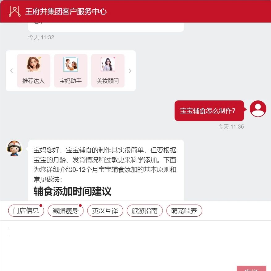 专为育儿家庭打造,,,,,,接纳亲热详尽的相同气概,,,,,,聚焦婴幼儿用品、亲子运动、母婴室位置等问题。。。。。。如:当宝妈询问 “宝宝辅食怎么制作” 时,,,,,,智能体不但会给出科学的辅食添加原则,,,,,,还会提供详细的制作建议。。。。。。